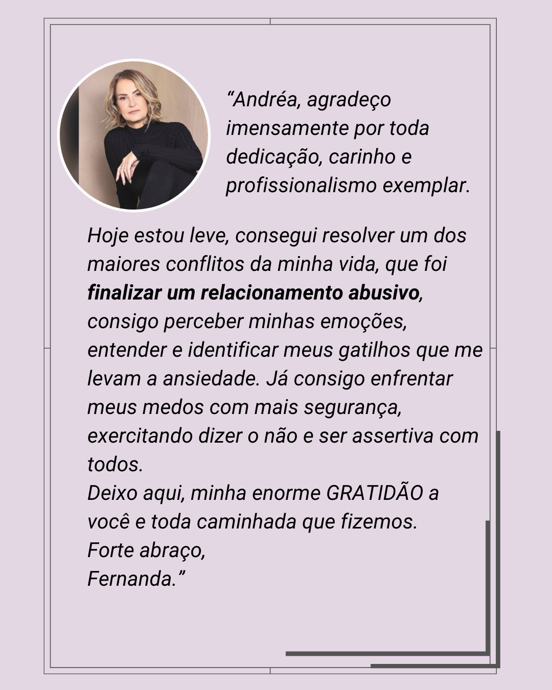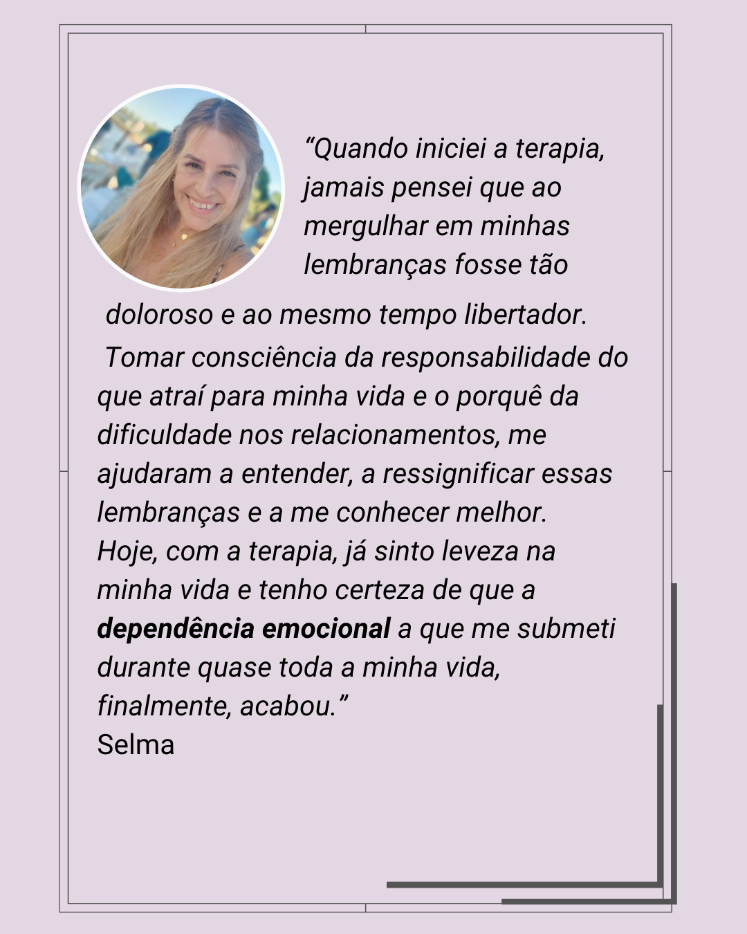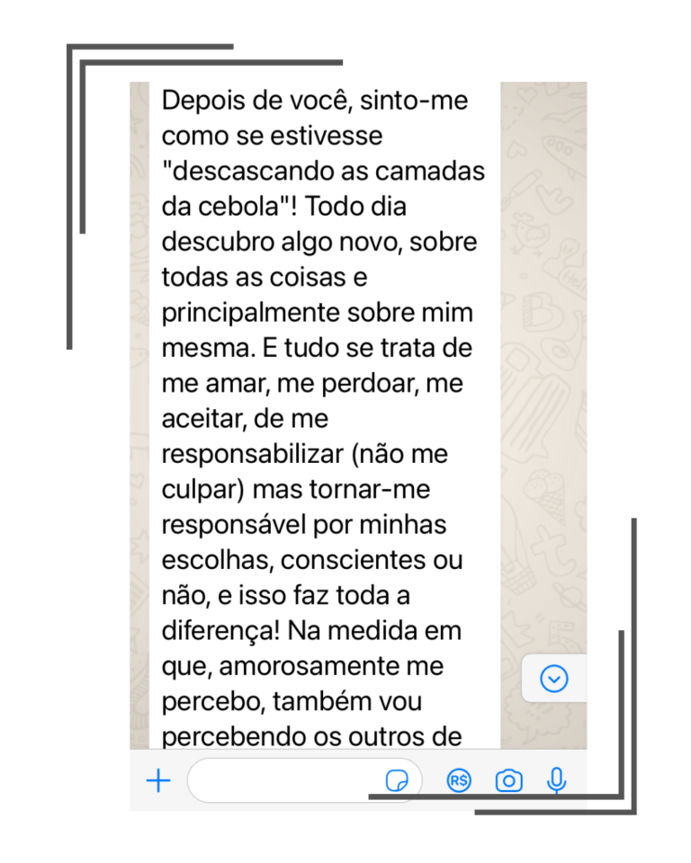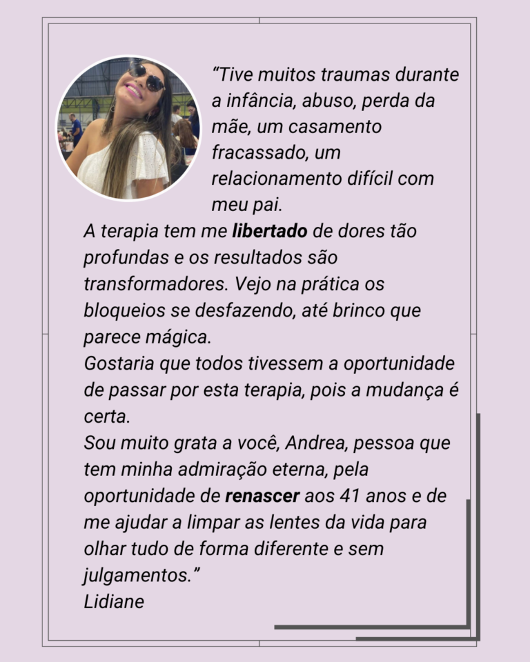 Sou master terapeuta especializada em traumas e possuo mais de 500 horas de experiência em atendimento a mulheres que querem se libertar de suas dores emocionais para seguirem a vida com mais leveza.